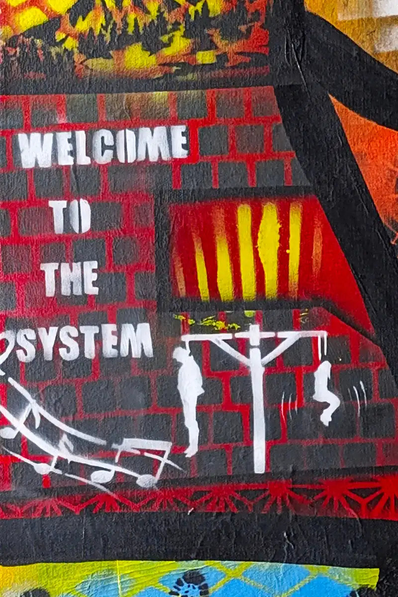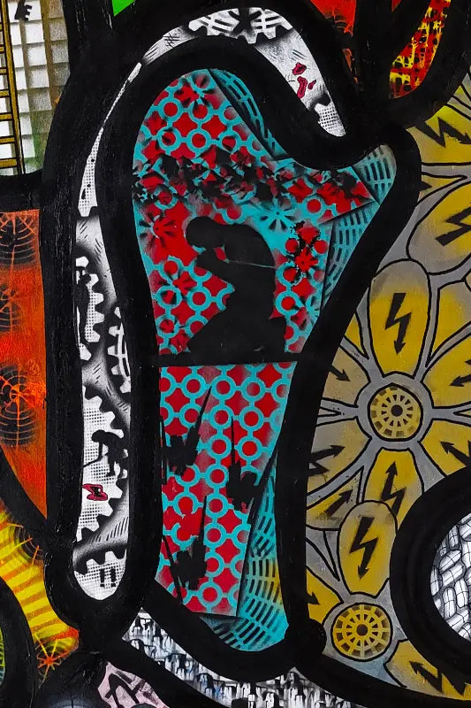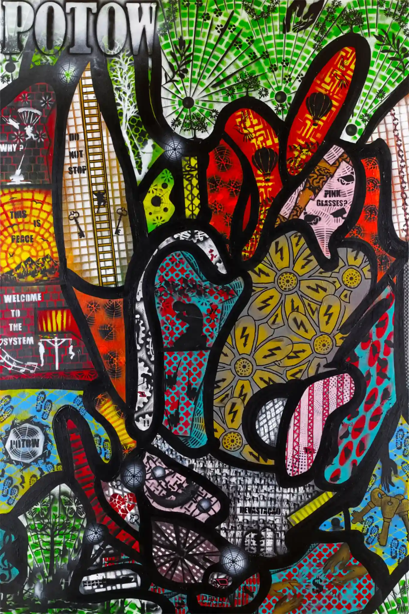 Acrylic paint, airbrush, marker, spray paint on canvas
