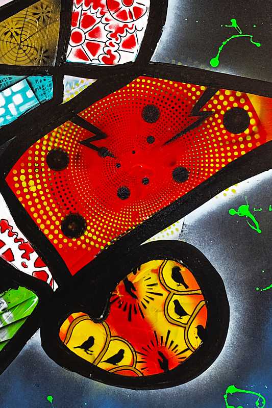 Acrylic paint, airbrush, marker, spray paint on canvas